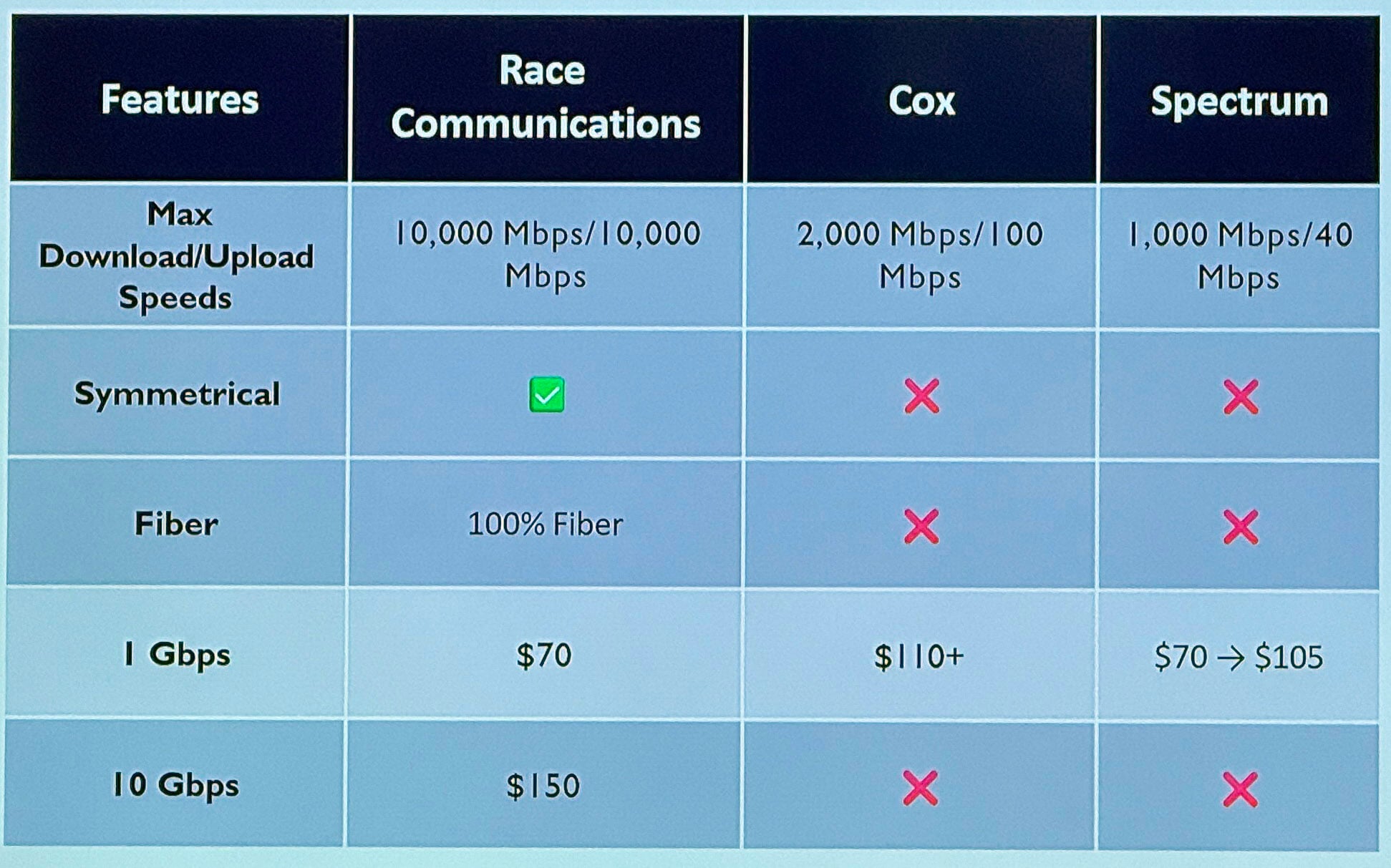 If you were considering changing your ISP to the all fiber Race network, they provided these charts: