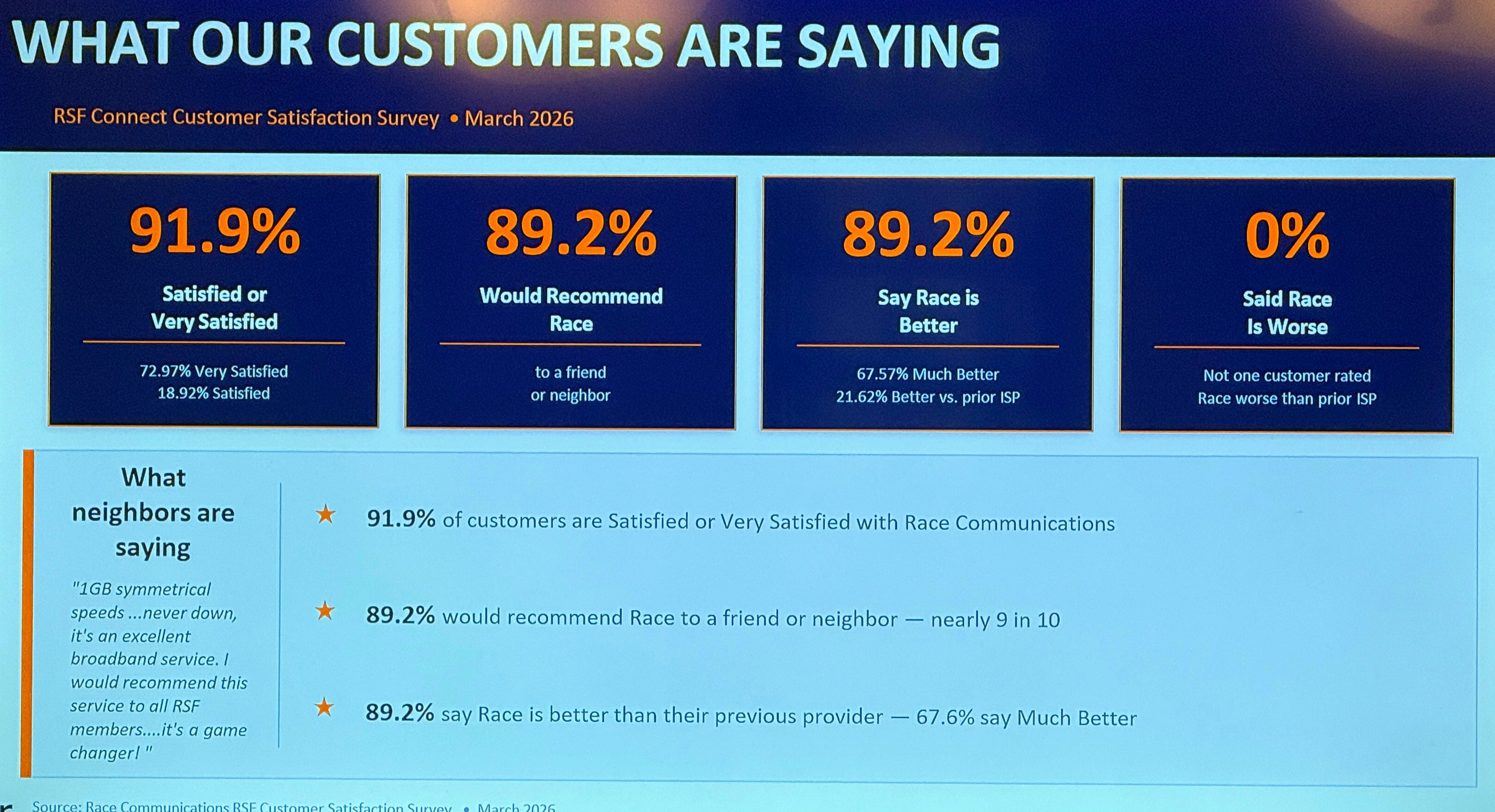 Race Communications presented a status report of their RSF Fiber Internet network. Interestingly, before the Board meeting, a Member told the presenter that her Internet was awful. It turns out she was referring to her wireless WiFi network in her house.