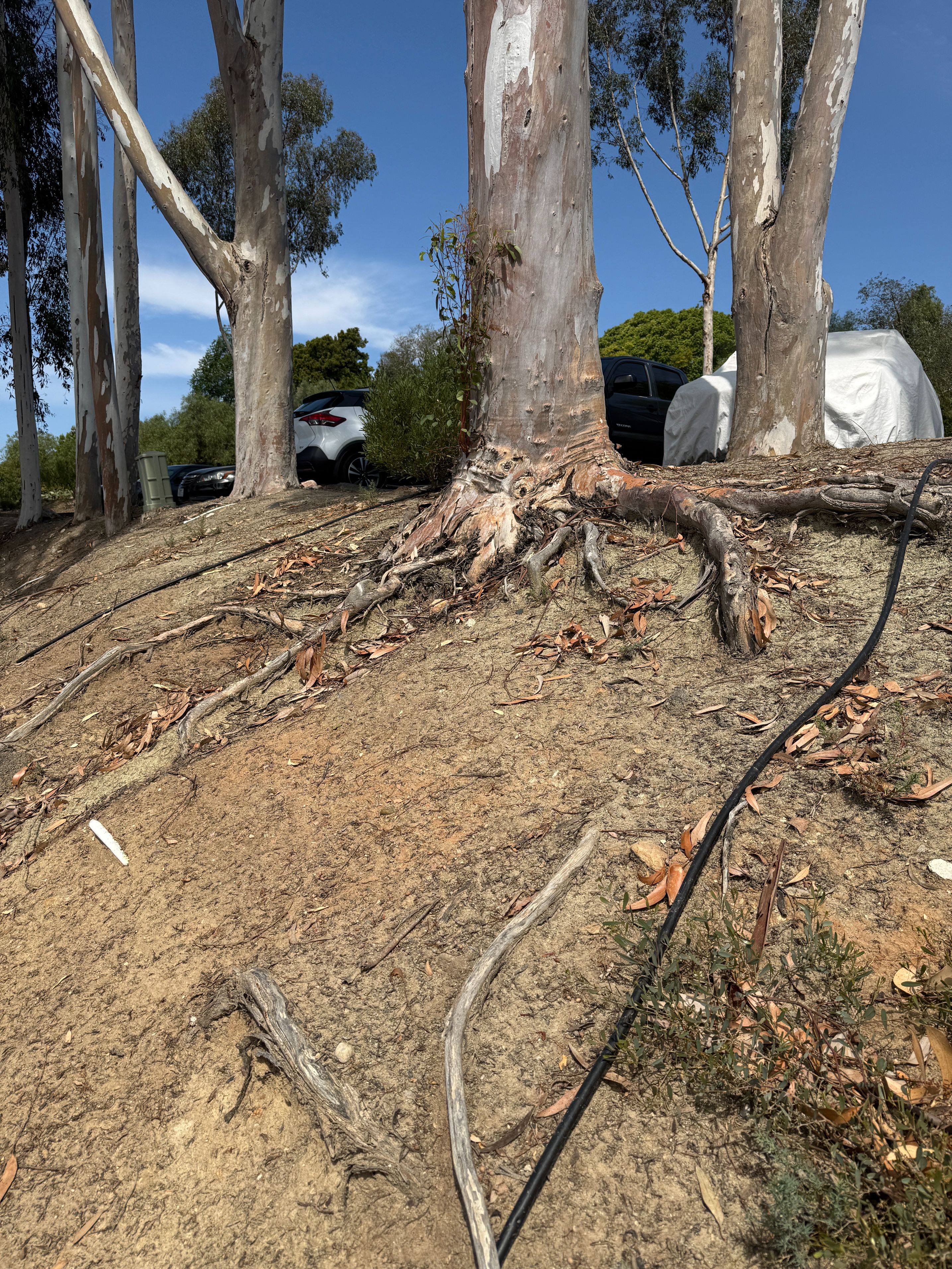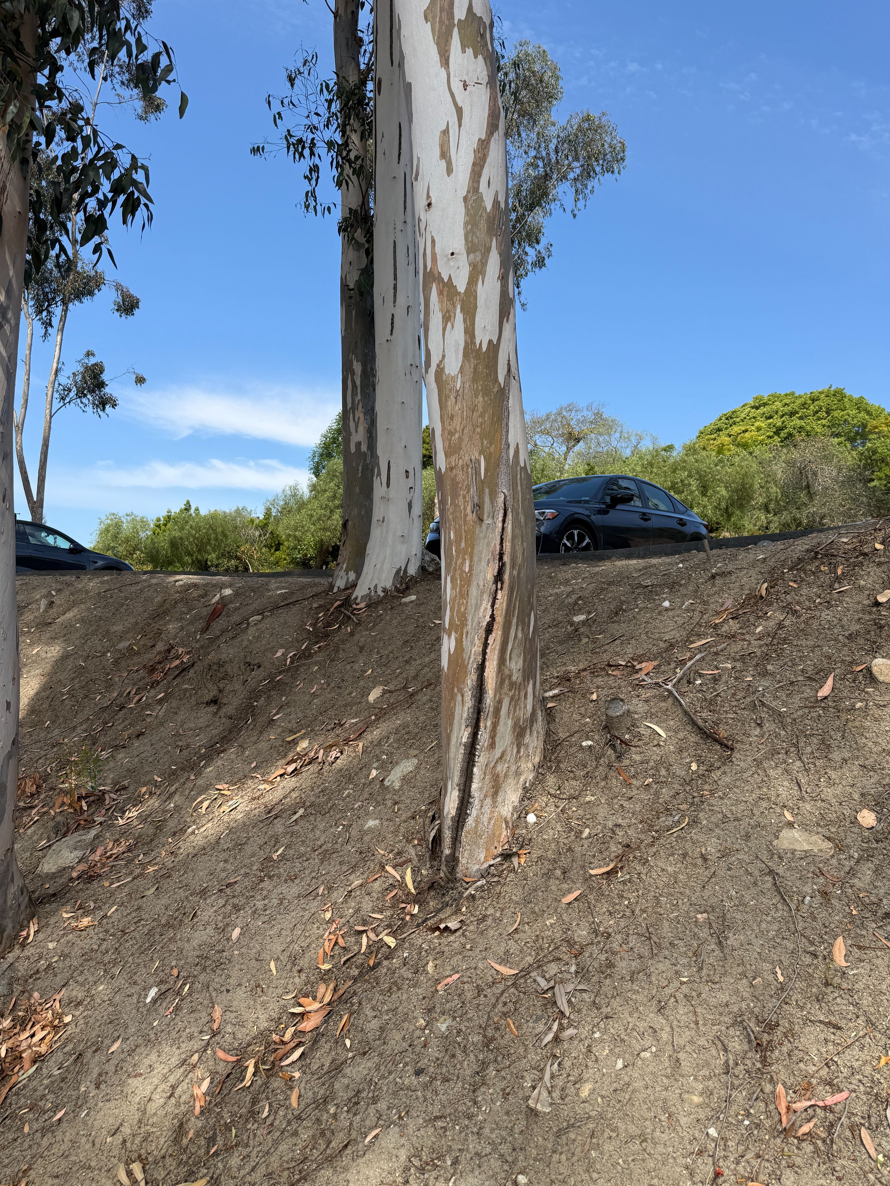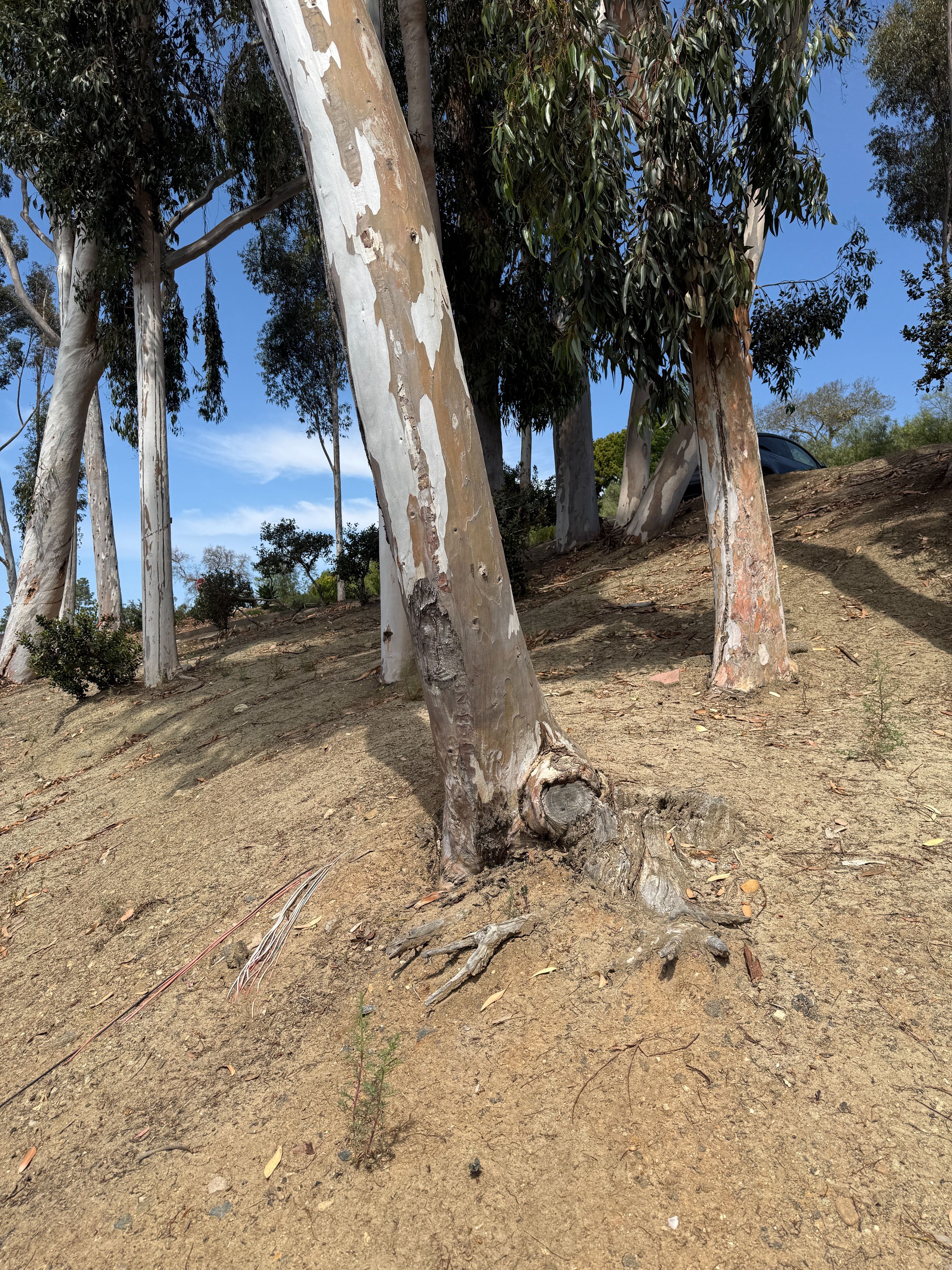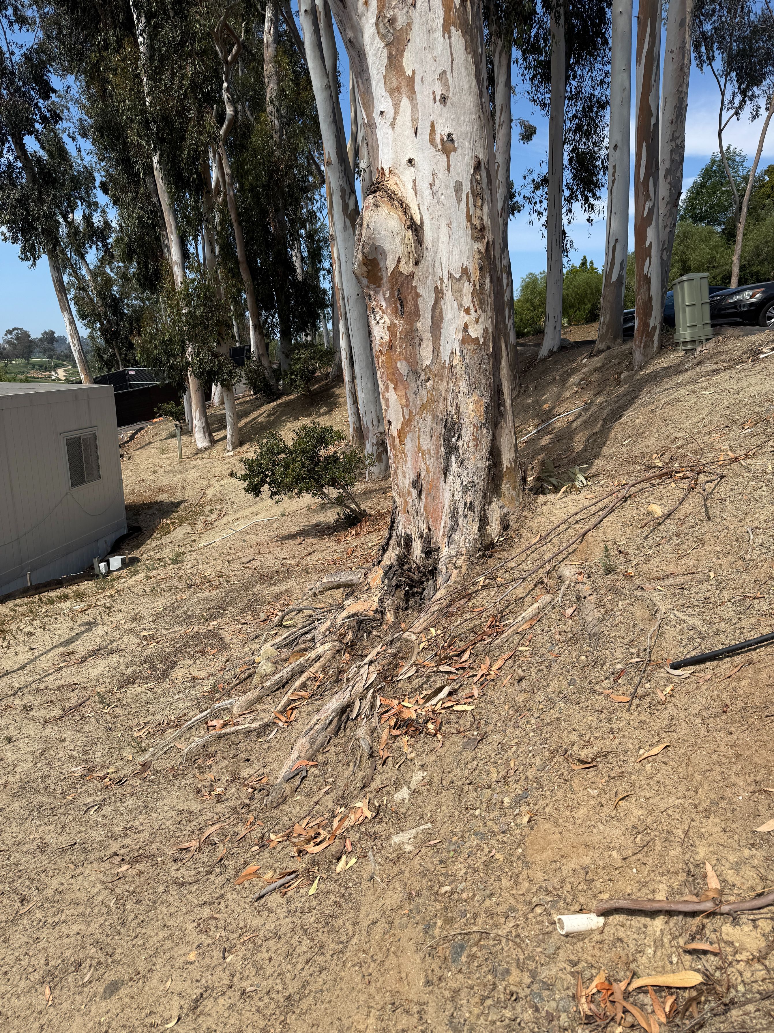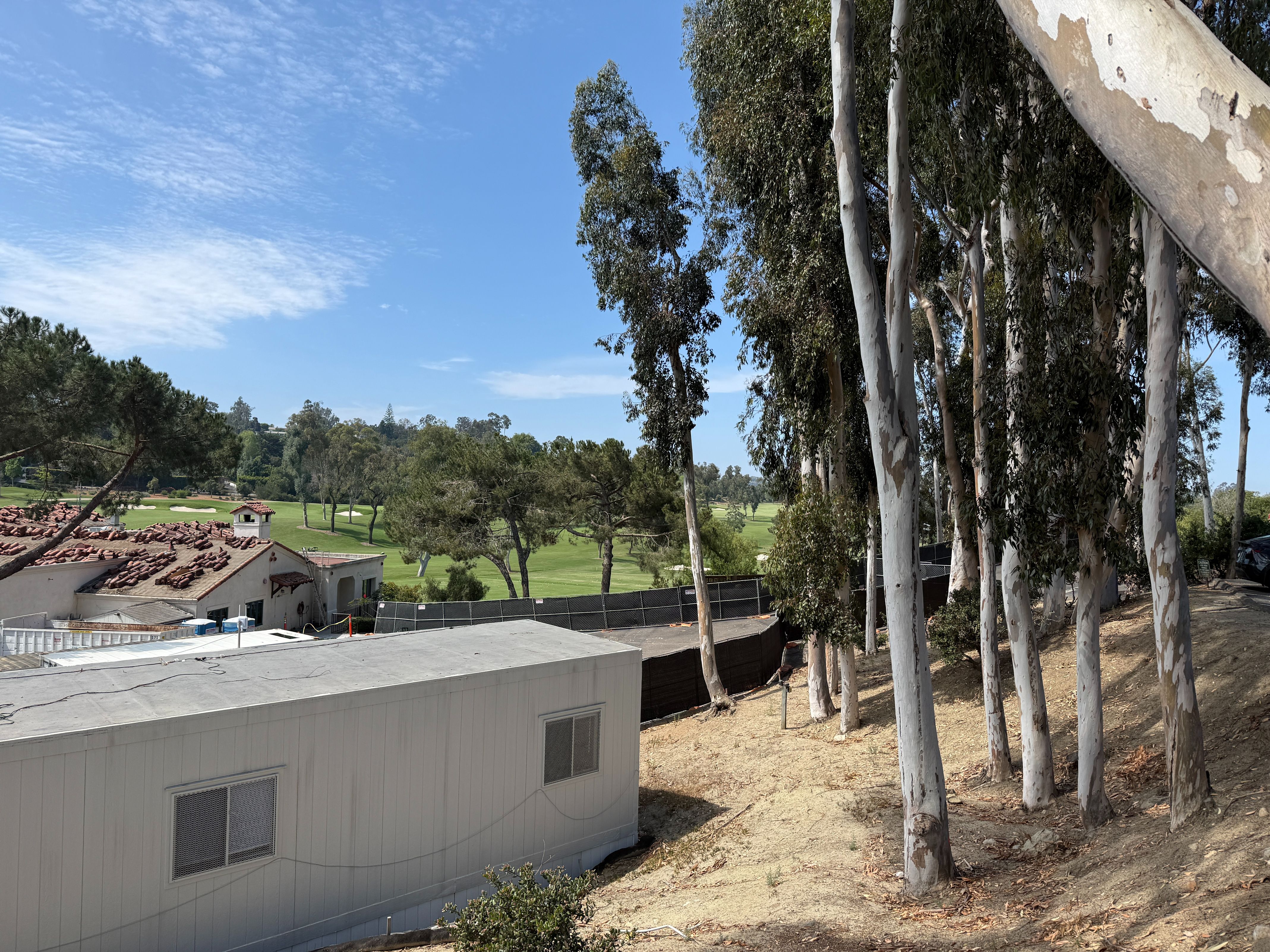 These trees (see above) on the golf/tennis court parking lot planted on a severe slope have already shed big branches onto cars during and after storms. I know at least one employee who had $20K of damage to their car when a big branch fell and caved in their car roof. Not only are the branches dangerous, but thin Eucalyptus like this planted on highly sloped hillsides have small root balls which can cause them to fall over in a storm. I actually had two Eucalyptus trees on my previous property located on similar slopes that fell onto my house roof, and these ones are primed to fall onto the new restaurant roof.